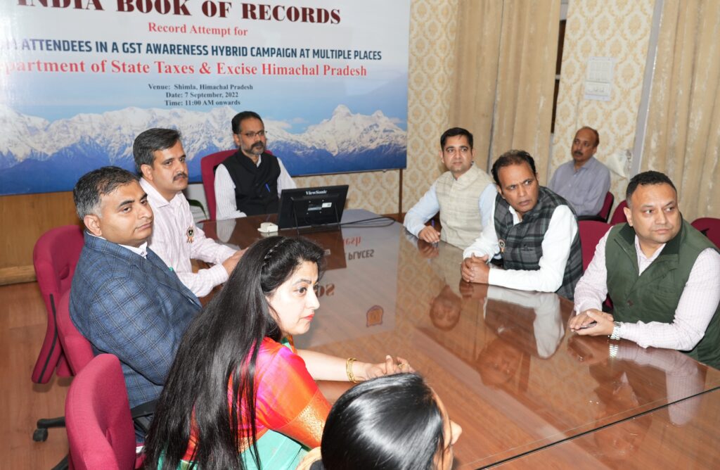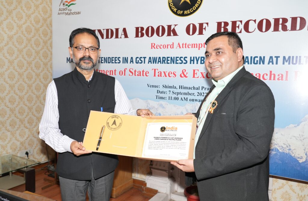 ब्यूरो//दैनिक हिमाचल न्यूज:- राज्य कर एवं आबकारी विभाग ने आजादी का अमृत महोत्सव के तहत आम व्यापारियों, उद्यमियों, उद्योगपतियों और अन्य हितधारकों को वस्तु एवं सेवा कर (जीएसटी) के संबंध में विस्तृत जानकारी प्रदान करने के लिए आज एक प्रदेशव्यापी जागरुकता कार्यक्रम आयोजित किया। विभाग के सभी 13 राजस्व जिलों के कुल 38 मुख्य स्थानों पर आयोजित इन जागरुकता कार्यक्रमों में करीब 4400 व्यापारियों, उद्योगपतियों, युवा उद्यमियों और अन्य हितधारकों ने भाग लेकर एक रिकॉर्ड कायम किया। राज्य कर एवं आबकारी विभाग के इस प्रदेशव्यापी जागरुकता कार्यक्रम में रिकॉर्ड संख्या में भागीदारी को इंडिया बुक ऑफ रिकॉर्ड्स में दर्ज किया गया।  यहां प्रदेश सचिवालय के समिति कक्ष में आयोजित इस जागरुकता कार्यक्रम के समापन अवसर पर राज्य कर एवं आबकारी विभाग के प्रधान सचिव सुभासीष पन्डा को इंडिया बुक ऑफ रिकॉर्ड्स के मुख्य निर्णायक भानु प्रताप सिंह ने विधिवत रूप से इस रिकॉर्ड का प्रमाण पत्र सौंपा।