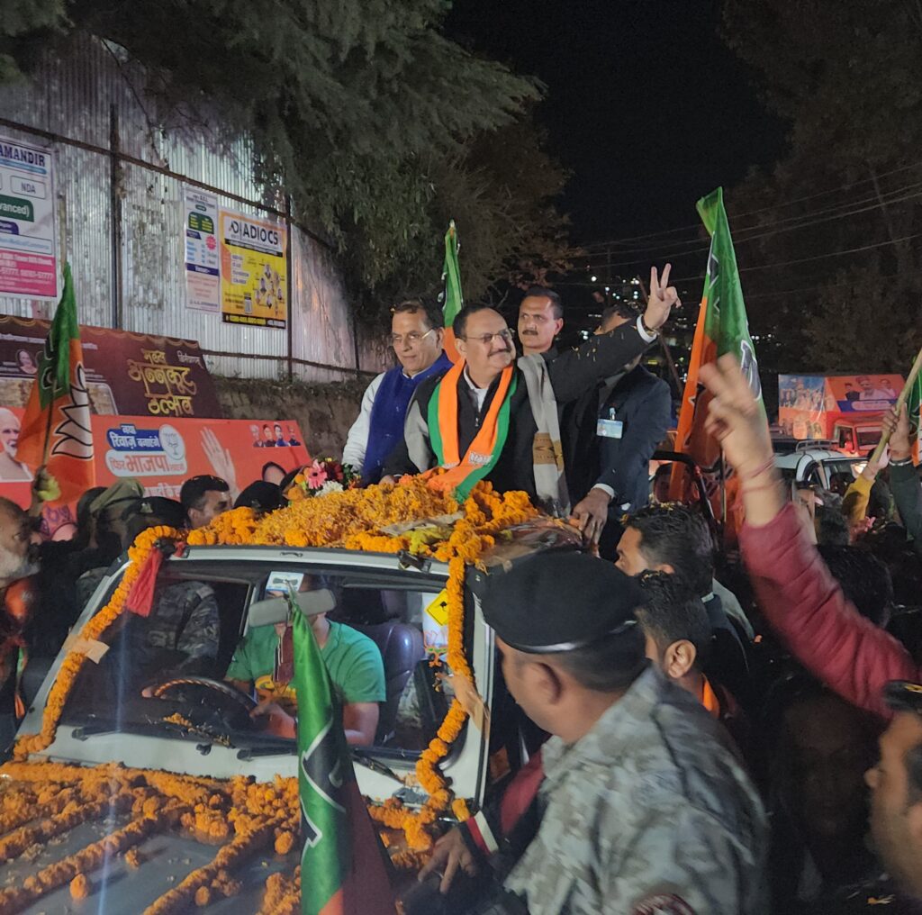 राष्ट्रीय अध्यक्ष नड्डा ओपन जिप्सी में गए और सभी कार्यकर्ताओं के साथ न्यू शिमला में इस रोड शो में भाग लिया।