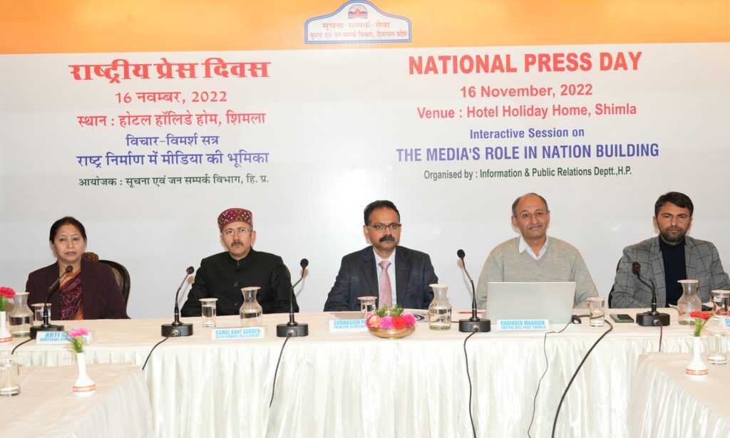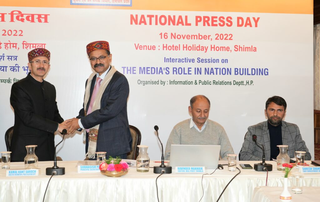ब्यूरो, दैनिक हिमाचल न्यूज :- राष्ट्रीय प्रेस दिवस के अवसर पर सूचना एवं जन संपर्क विभाग द्वारा आज यहां आयोजित राज्य स्तरीय कार्यक्रम में राष्ट्र निर्माण में मीडिया की भूमिका विषय पर विचार-विमर्श सत्र आयोजित किया गया। इस अवसर पर सूचना एवं जन संपर्क विभाग के प्रधान सचिव सुभासीष पन्डा मुख्य अतिथि के रूप में शामिल हुए। न्यूज़ वेबसाईट हिल पोस्ट के सम्पादक रविंद्र मखाईक और अमर उजाला के राज्य ब्यूरो प्रमुख सुरेश शांडिल्य कार्यक्रम में मुख्य वक्ता के रूप में मौजूद रहे।