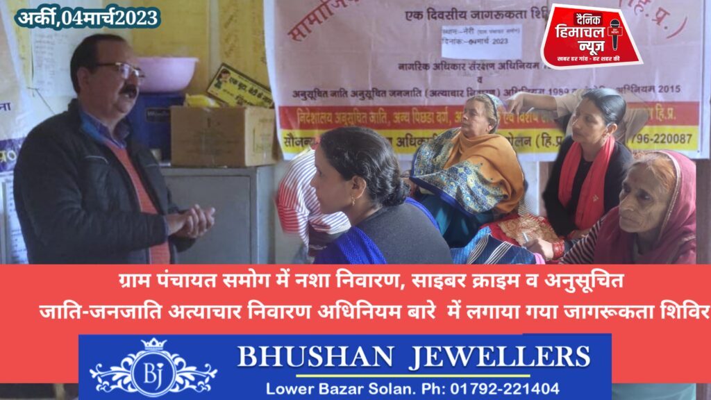 ब्यूरो, दैनिक हिमाचल न्यूज:- उपमंडल अर्की के अंतर्गत ग्राम पंचायत समोग के नेरी गांव में कल्याण विभाग द्वारा अनुसूचित जाति- जनजाति अत्याचार (निवारण) अधिनियम के विषय में जागरूकता हेतु शिविर का आयोजन किया गया।