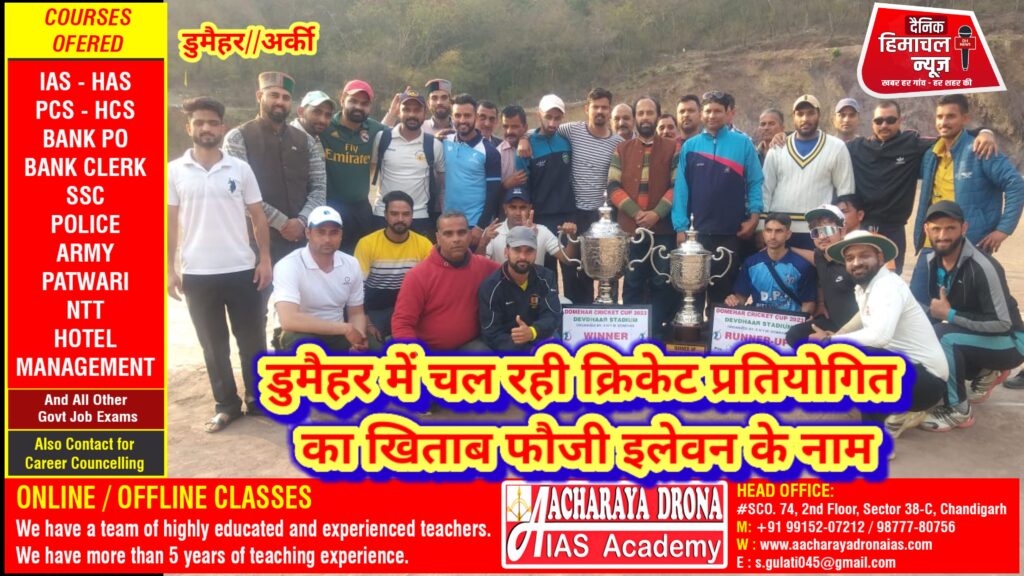 ब्यूरो, दैनिक हिमाचल न्यूज :- उपमंडल अर्की के अंतर्गत ग्राम पंचायत डुमैहर में शताब्दी युवक मंडल डुमैहर द्वारा चलाई जा रही क्रिकेट प्रतियोगिता का समापन हो गया। 12 जनवरी से शुरू हुई इस प्रतियोगिता के समापन समारोह में ब्लॉक कांग्रेस अर्की के अध्यक्ष सतीश कश्यप ने बतौर मुख्यातिथि के रूप में शिरकत की, जबकि नगर पंचायत अर्की के पूर्व अध्यक्ष अनुज गुप्ता व डुमैहर पंचायत के पूर्व उप प्रधान तिलक राज पाल विशेष अतिथि के रूप में उपस्थित रहे।
