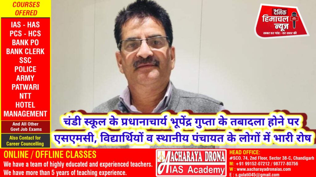 ब्यूरो, दैनिक हिमाचल न्यूज:- राजकीय वरिष्ठ माध्यमिक पाठशाला चंडी अर्की के प्रधानाचार्य भूपेंद्र गुप्ता के चंडी स्कूल से प्रारम्भिक उपनिदेशक कार्यालय सोलन को तबादला होने पर एसएमसी समस्त ग्रामीणों,बच्चों के अभिभावकों,प्रधान ग्राम पंचायत चंडी सेवड़ा में भारी रोष है।
