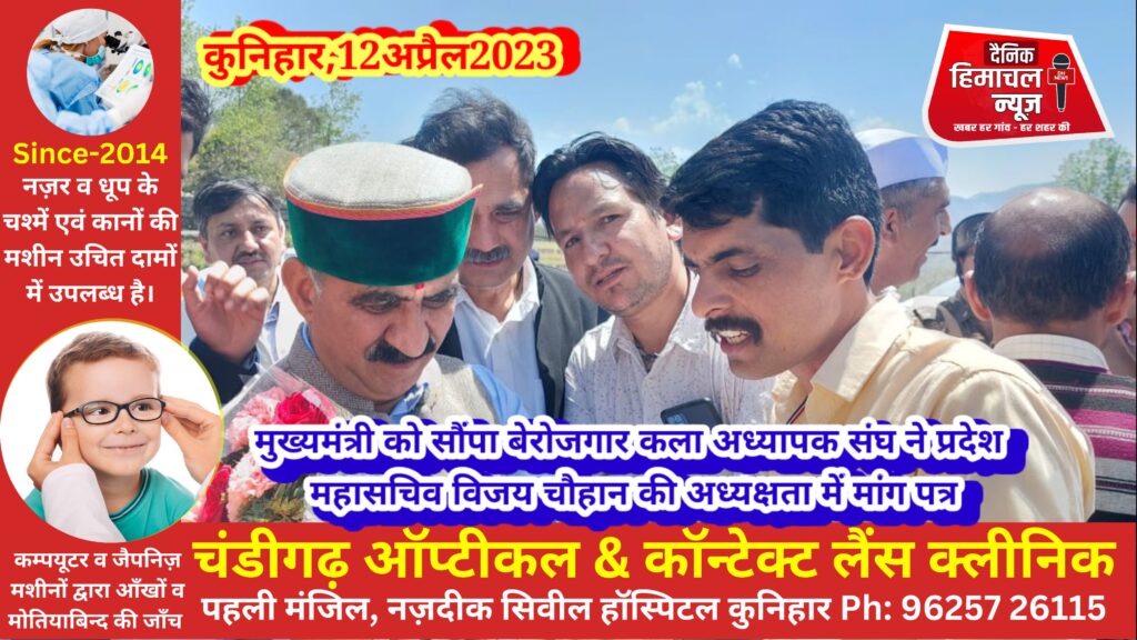 ब्यूरो, दैनिक हिमाचल न्यूज:- अर्की उपमण्डल के कुनिहार स्थित बनिया देवी हैलीपैड पर बेरोजगार कला अध्यापक संघ के प्रदेश महासचिव विजय चौहान की अध्यक्षता में मुख्यमंत्री सुखविंदर सिंह ठाकुर, लोक निर्माण विभाग मंत्री विक्रमादित्य सिंह व मुख्य संसदीय सचिव संजय अवस्थी से मिला।