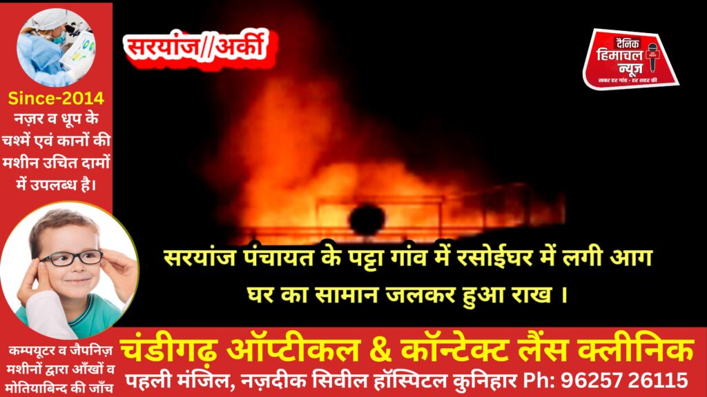 ब्यूरो, दैनिक हिमाचल न्यूज:- अर्की के ग्राम पंचायत सरयांज के गांव पट्टा में एक व्यक्ति के रसोईघर में आग लगने के कारण काफी नुकसान हुआ है ।