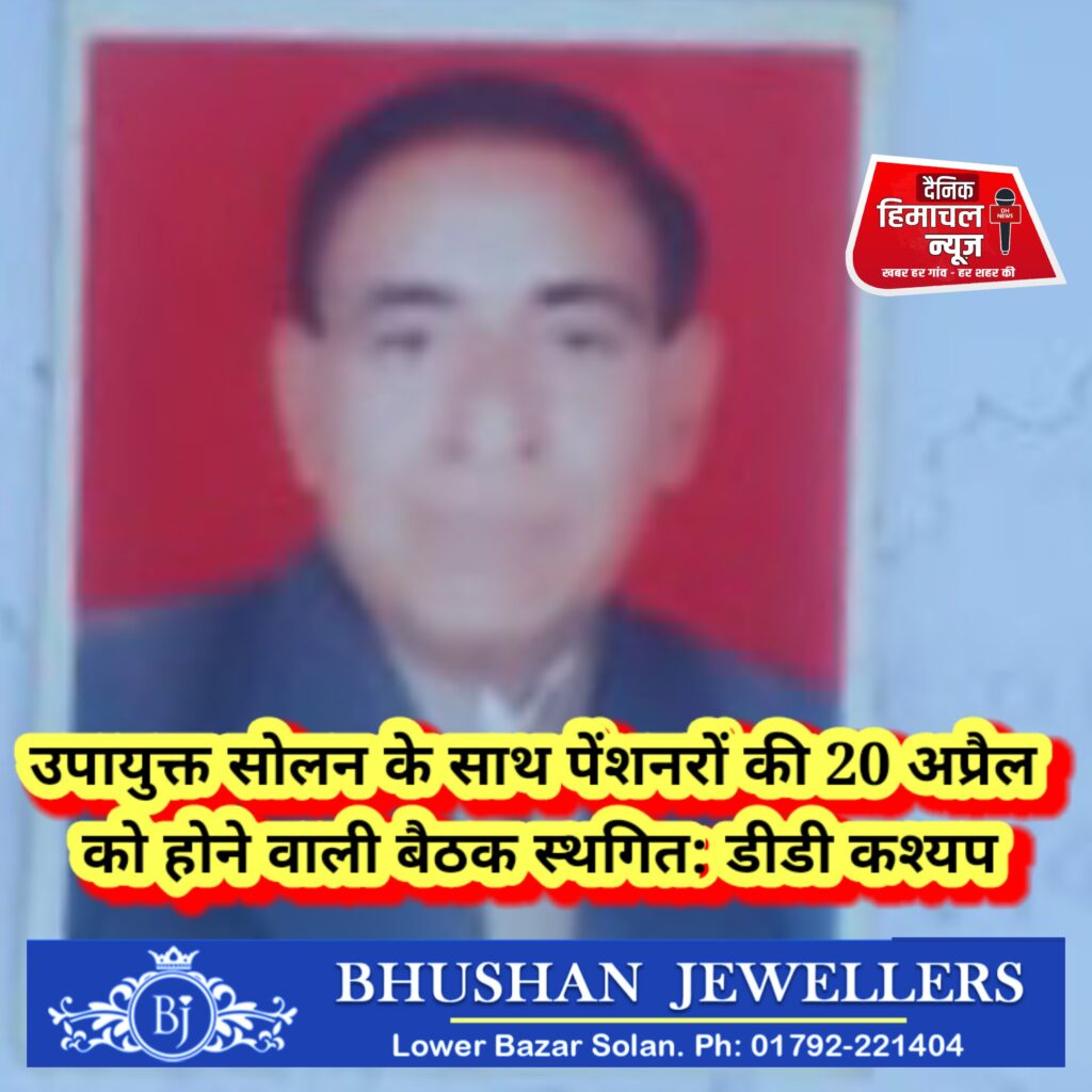 ब्यूरो, दैनिक हिमाचल न्यूज:- उपायुक्त सोलन के साथ 20 अप्रैल, 2023 को होने वाली जिला पैंशनर्ज एवं वरिष्ठ नागरिक कल्याण संगठन सोलन की संयुक्त सलाहकार समिति की बैठक किन्हीं अपरिहार्य कारणों के चलते स्थगित कर दी गई हैं।