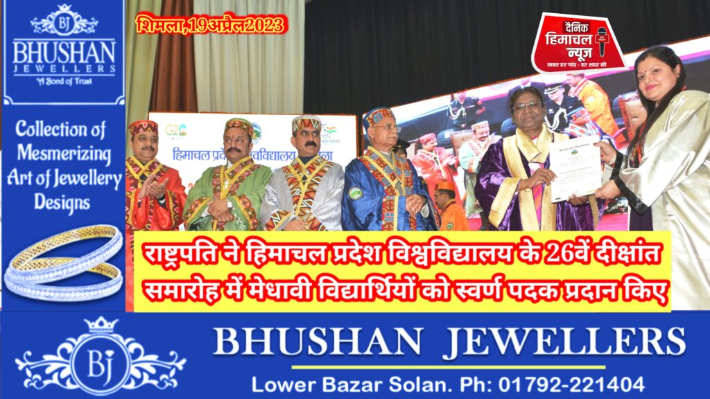 ब्यूरो, दैनिक हिमाचल न्यूज:- राष्ट्रपति श्रीमती द्रौपदी मुर्मु ने आज हिमाचल प्रदेश विश्वविद्यालय के सभागार में आयोजित 26वें दीक्षांत समारोह में 10 मेधावी विद्यार्थियों को स्वर्ण पदक प्रदान किए।