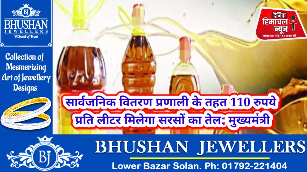 ब्यूरो, दैनिक हिमाचल न्यूज:-मुख्यमंत्री ठाकुर सुखविंदर सिंह सुक्खू ने आज यहां कहा कि प्रदेश सरकार सार्वजनिक वितरण प्रणाली के लाभार्थियों को उपदान दरों पर गुणवत्तापूर्ण खाद्यान्न उपलब्ध करवाने के लिए प्रतिबद्ध है। उन्होंने कहा कि प्रदेश सरकार ने उपभोक्ताओं को राहत प्रदान करते हुए उचित मूल्य की दुकानों के माध्यम से दिये जाने वाला सरसों का तेल 110 रुपये प्रति लीटर उपलब्ध करवाने का निर्णय लिया है।