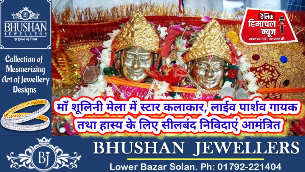 निविदा सूचना के अनुसार राज्य स्तरीय माँ शूलिनी मेला की सांस्कृतिक संध्याओं में लाईव पार्शव गायक, हास्य कलाकार, पंजाबी गायक तथा कवाली एवं सूफी गायकों इत्यादि को आमंत्रित किया जाना है। इस संदर्भ में निविदाएं प्रपत्र एवं विवरण अतिरिक्त उपायुक्त सोलन के कार्यालय से किसी भी कार्य दिवस पर कार्यालय समय में प्राप्त किया जा सकता है। निविदा प्रपत्र एवं विवरण वेबसाइट www.hpsolan.gov.in पर भी उपलब्ध है।
