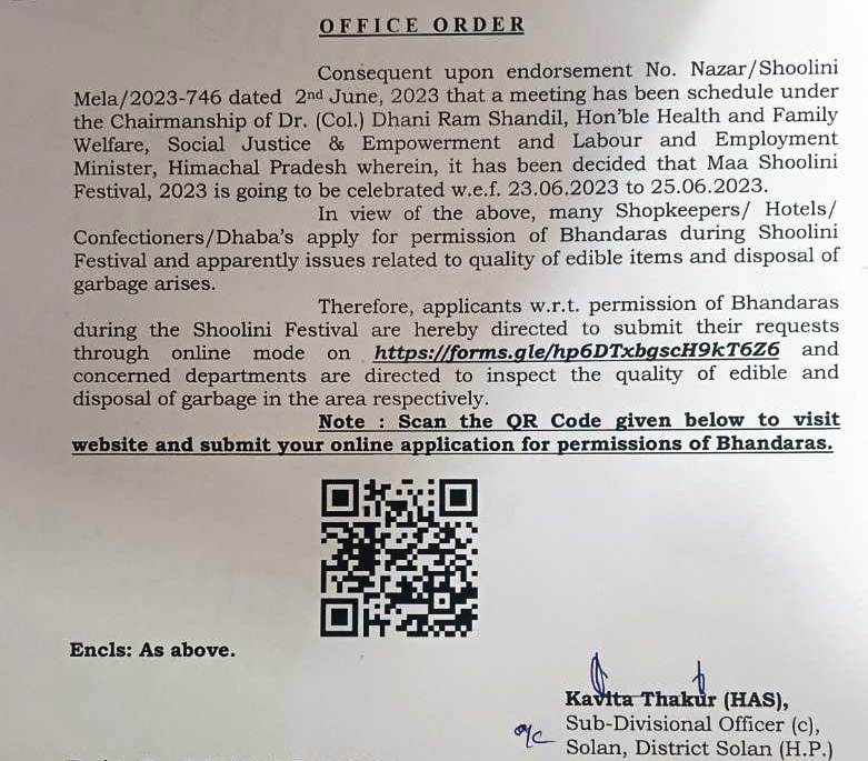 ब्यूरो, दैनिक हिमाचल न्यूज:- राज्य स्तरीय माँ शूलिनी मेला में विभिन्न संस्थाओं एवं व्यक्तियों द्वारा आयोजित किए जाने वाले भण्डारों की अनुमति आनलाइन प्राप्त करनी होगी। यह जानकारी उपमण्डलाधिकारी सोलन कविता ठाकुर ने दी।