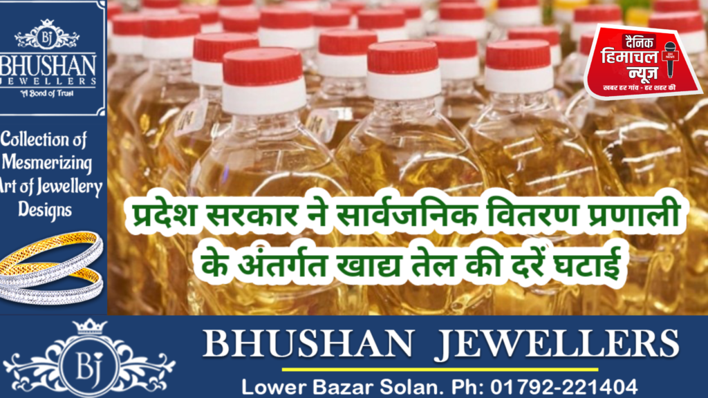 ब्यूरो, दैनिक हिमाचल न्यूज:- प्रदेश सरकार आम आदमी को राहत पहुंचाते हुए ‘व्यवस्था परिवर्तन’ के अपने संकल्प को खाद्य एवं नागरिक आपूर्ति विभाग में भी सक्रिय दृष्टिकोण से कार्यान्वित कर रही है। इसके दृष्टिगत राज्य सरकार ने प्रदेशवासियों को किफायती दरों पर फोर्टिफाइड खाद्य तेल उपलब्ध करवाने के लिए महत्वपूर्ण कदम उठाए हैं।