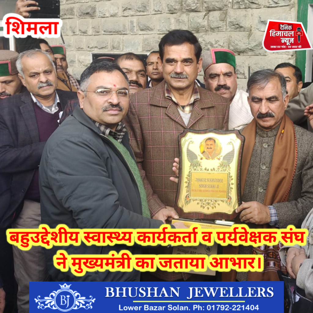 ब्यूरो, दैनिक हिमाचल न्यूज:- बहुउद्देशीय स्वास्थ्य कार्यकर्ता एवं पर्यवेक्षक संघ हिमाचल प्रदेश ने मुख्यमंत्री सुखविंदर सिंह सुक्खू, स्वास्थ्य एवं परिवार कल्याण मंत्री डॉ कर्नल धनीराम शांडिल, मुख्य संसदीय सचिव स्वास्थ्य एवं परिवार कल्याण विभाग संजय अवस्थी हिमाचल प्रदेश सरकार का हार्दिक धन्यवाद किया है। जिन्होंने 50 महिला स्वास्थ्य कार्यकर्ताओं का 15 दिवसीय पदोन्नत प्रशिक्षण, उनकी महिला स्वास्थ्य कार्यकर्ता से महिला स्वास्थ्य पर्यवेक्षक के पद पदोन्नति बैच भेजने के लिए धन्यवाद किया है।
