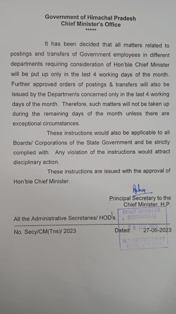 ब्यूरो,दैनिक हिमाचल न्यूज:- राज्य सरकार के एक प्रवक्ता ने आज यहां बताया कि विभिन्न विभागों में सरकारी कर्मचारियों की तैनाती और तबादलों से संबंधित सभी मामले, जिन पर मुख्यमंत्री ठाकुर सुखविंदर सिंह सुक्खू के विचार की आवश्यकता है, उन पर महीने के अंतिम चार कार्य दिवसों में विचार किया जाएगा।