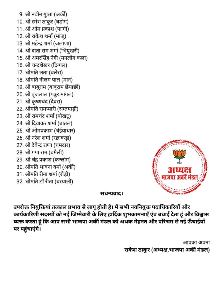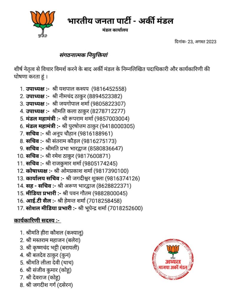 भाजपा अर्की मण्डल ने किया कार्यकारिणी का विस्तार, किसको क्या मिली अहम जिम्मेवारी,पढ़ें पूरी खबर