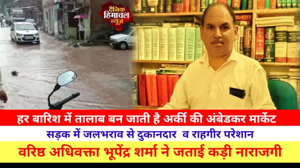 ब्यूरो, दैनिक हिमाचल न्यूज़- अर्की मुख्यालय की अंबेडकर मार्केट में जलभराव की समस्या अब एक गंभीर और नियमित संकट बन चुकी है, लेकिन इसके समाधान की दिशा में प्रशासन द्वारा कोई ठोस कदम नहीं उठाया गया है। रविवार सुबह हुई तेज बारिश के बाद एक बार फिर सड़क मार्ग में पानी भर गया और मुख्य सड़क तालाब में तब्दील हो गई।
