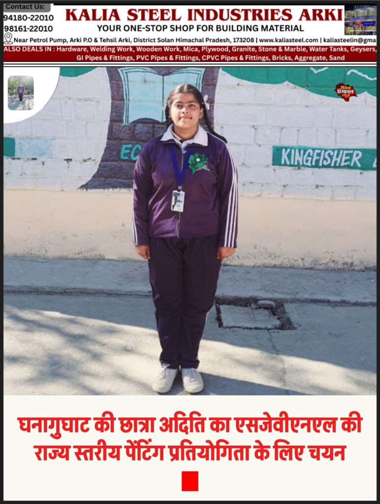 ब्यूरो, दैनिक हिमाचल न्यूज – उपमण्डल अर्की के अंतर्गत राजकीय वरिष्ठ माध्यमिक विद्यालय घनागुघाट की कक्षा दस की छात्रा अदिति का सतलुज जल विद्युत निगम लिमिटेड द्वारा आयोजित की जाने वाली राज्य स्तरीय पर्यावरण पेंटिंग प्रतियोगिता के लिए चयन हुआ है। पहले चरण की प्रतियोगिता विद्यालय स्तर पर आयोजित हुई थी, जिसमें उत्कृष्ट प्रदर्शन के आधार पर अदिति को राज्य स्तर के लिए चुना गया।