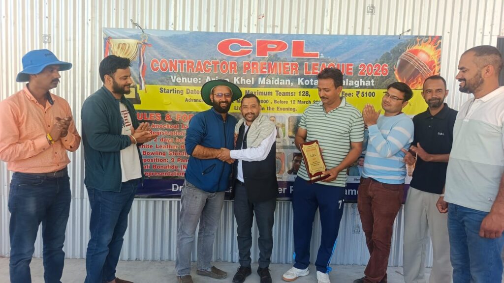 ब्यूरो, दैनिक हिमाचल न्यूज-  अर्जुन खेल मैदान कोटली (शालाघाट) में आयोजित कॉन्ट्रैक्टर प्रीमियर लीग (CPL) शालाघाट के सेमीफाइनल मुकाबले वीरवार को खेले गए। इस अवसर पर एडवोकेट भीम सिंह ठाकुर ने मुख्य अतिथि के रूप में शिरकत की। आयोजकों द्वारा उनका गर्मजोशी से स्वागत किया गया। इसके उपरांत आयोजन समिति की ओर से मुख्य अतिथि को शॉल व स्मृति चिन्ह भेंट कर सम्मानित किया गया।