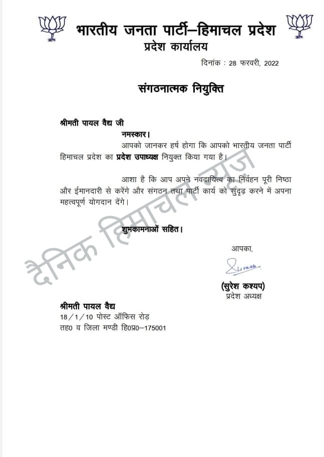 शिमला,भाजपा के प्रदेशाध्यक्ष सुरेश कश्यप ने पायल वैद्य को प्रदेश उपाध्यक्ष नियुक्त किया है ।