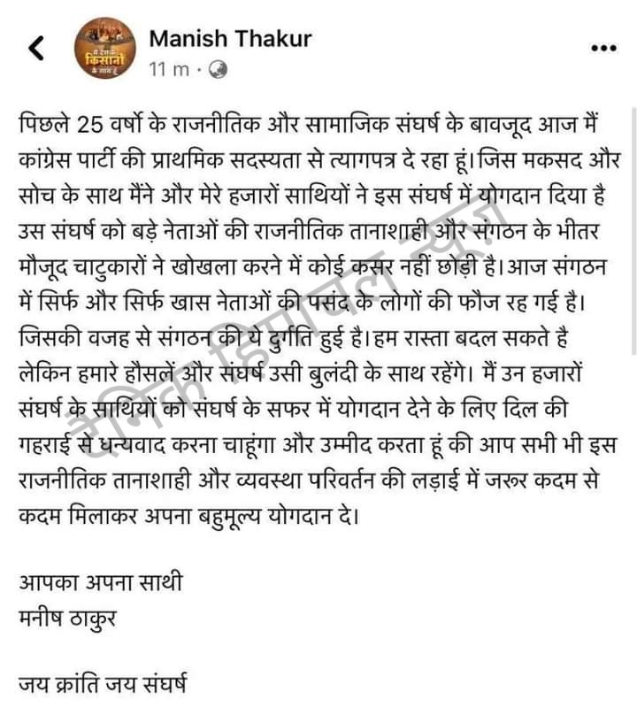 पूर्व युंका प्रदेशाध्यक्ष मनीष ठाकुर ने कांग्रेस पार्टी की प्राथमिक सदस्यता से दिया इस्तीफा ।