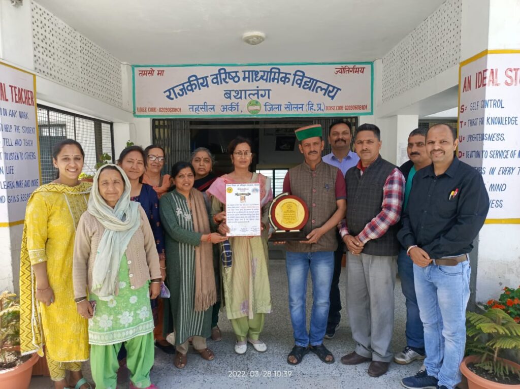 अर्की,जिला शिक्षा एवं प्रशिक्षण संस्थान सोलन द्वारा जिला स्तरीय स्कूल प्रबंधन समिति सम्मान एवं सहयोग के लिए आभार सम्मान समारोह का आयोजन किया गया । जिसमें राजकीय वरिष्ठ माध्यमिक विद्यालय बथालंग को ब्लॉक स्तर में प्रथम आने पर स्वास्थ्य मंत्री डॉ राजीव सैजल ने पुरस्कार देकर सम्मानित किया । उत्कृष्ट कार्यो के लिए एसएमसी को स्मृति चिन्ह व प्रशस्ति पत्र देकर सम्मानित किया गया ।