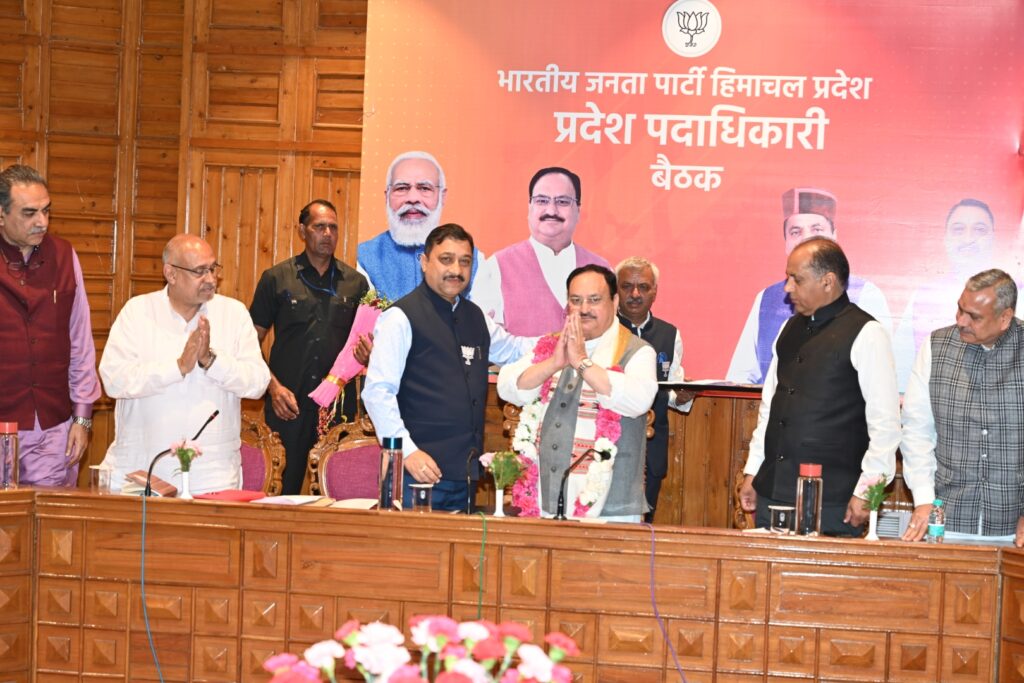 प्रदेश भाजपा अध्यक्ष सुरेश कश्यप ने भाजपा के राष्ट्रीय अध्यक्ष का स्वागत करते हुए कहा कि बूथ स्तर तक त्रिदेव की संकल्पना करने वाला हिमाचल देश का पहला राज्य है। उन्होंने कहा कि भाजपा राज्य में अपना आधार मजबूत करने में सफल रही है। उन्होंने कहा कि चलंे बूथ की ओर-बढ़ें जीत की ओर के अन्तर्गत प्रदेश में महासम्पर्क महा अभियान शुरू किया गया है। उन्होंने कहा कि कोरोना महामारी के दौरान जरूरतमंद लोगों की सहायता करने में भाजपा कार्यकर्ताओं ने सराहनीय कार्य किया है। उन्होंने भाजपा के राष्ट्रीय अध्यक्ष को आश्वासन दिया कि भाजपा राज्य में फिर से अपनी सरकार बनाएगी।
