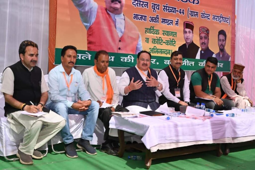 ब्यूरो, दैनिक हिमाचल न्यूज :- भाजपा राष्ट्रीय अध्यक्ष जगत प्रकाश नड्डा रविवार को अर्की विधानसभा क्षेत्र के दसेरन बूथ संख्या 44 ग्राम केंद्र भराड़ीघाट पहुंचे। उनके साथ प्रदेश अध्यक्ष सुरेश कश्यप उपस्थित रहे। इस दौरान जेपी नड्डा ने बूथ अध्यक्ष चत्तर सिंह, बूथ पालक भूप सिंह और बीएलए हीरा लाल गर्ग से मुलाकात की।