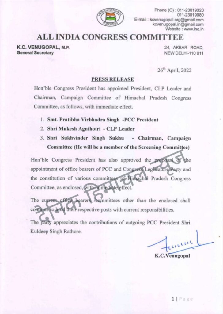 प्रतिभा सिंह को मिली हिमाचल कांग्रेस की कमान,जाने किस को क्या दी गई जिम्मेवारी👉