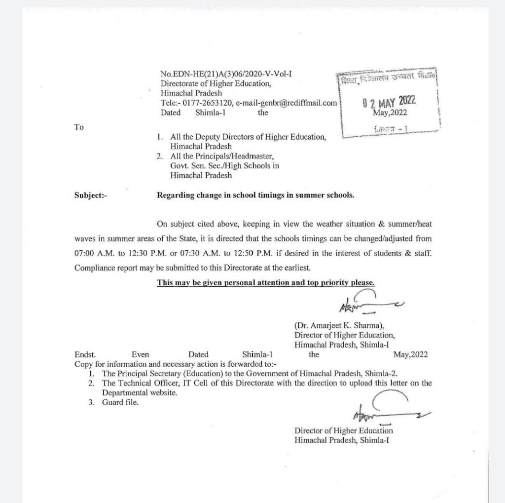 भारी गर्मी के चलते प्रदेश में जरूरत अनुसार स्कूलों का समय 7 बजे से 12:50 के बीच करने के शिक्षा विभाग के निर्देश
