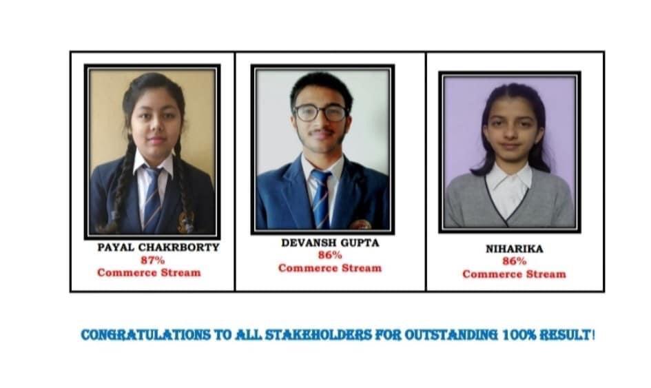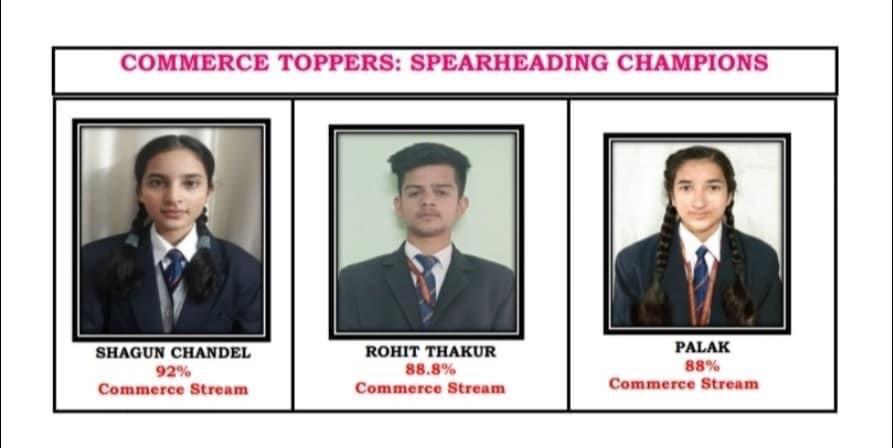 वहीं वाणिज्य संकाय में 32 में से 10 बच्चों ने 75 प्रतिशत से अधिक अंक हासिल किए।स्कूल प्रबंधन समिति के चेयरमैन दीपक जसुजा ओर  प्रधानाचार्य मुकेश ठाकुर ने बच्चों को ढेर सारी शुभकामनायें दी।प्रधानाचार्य मुकेश ठाकुर ने कहा की इस बेहतरीन प्रदर्शन का श्रेय विद्यार्थियों के कठिन परिश्रम,अभिभावकों का साथ और निपुण तथा योग्य अध्यापकों की मेहनत को जाता है।उन्होने विद्यार्थियों को कड़ी मेहनत से आगे बढ्ने तथा सफलता की बुलंदियों को छूने की प्रेरणा दी और भविष्य के लिए शुभकामनाएं दी।